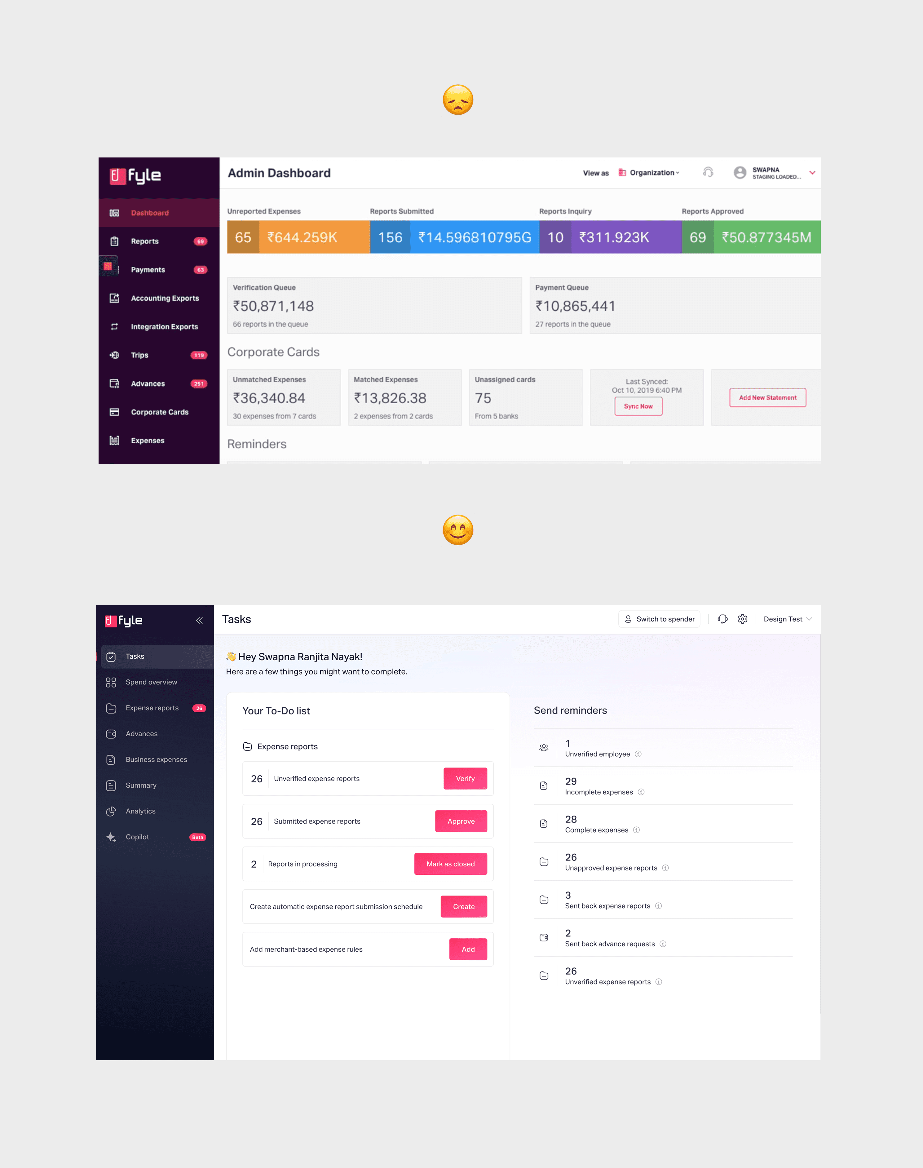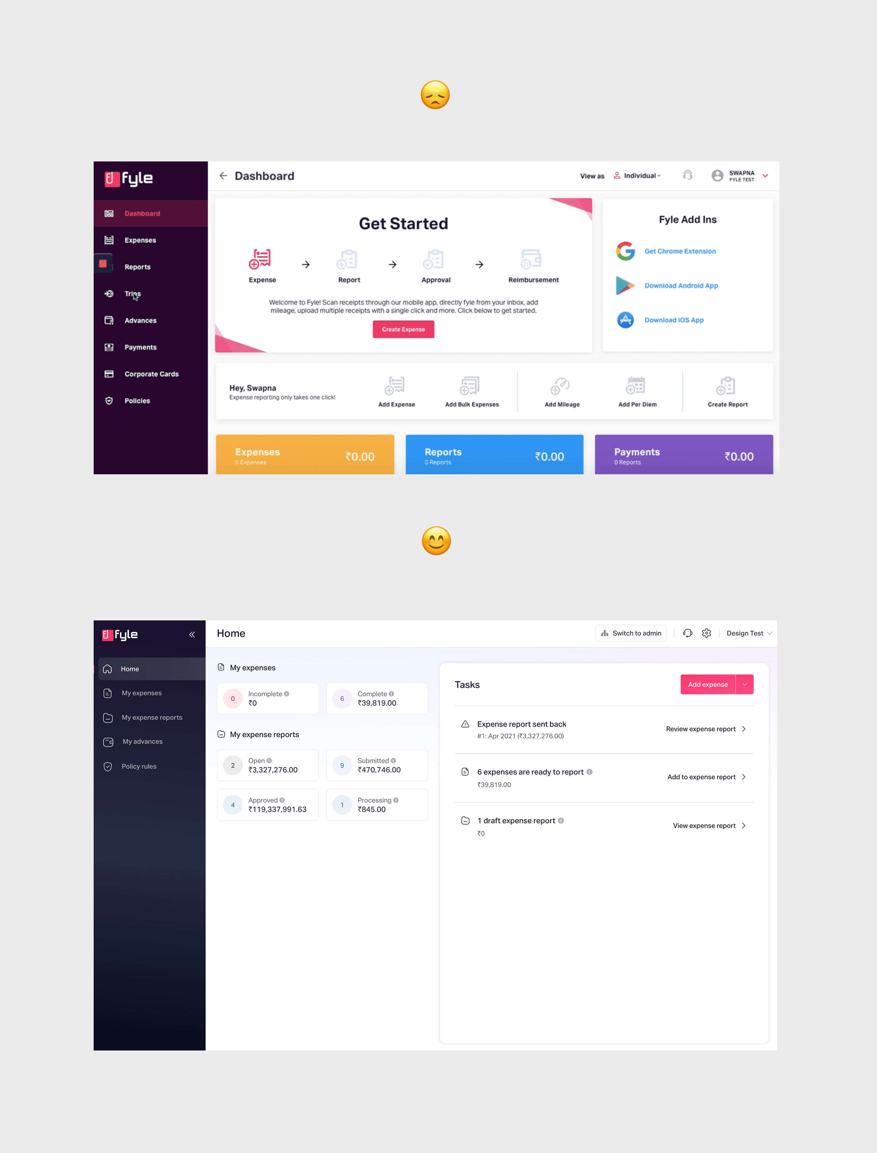 When I joined Fyle, I found much of product architecture didn’t align with users’ mental models. Hence through a planned roadmap, I was able to brought ~80% overhaul of product despite engg push backs.