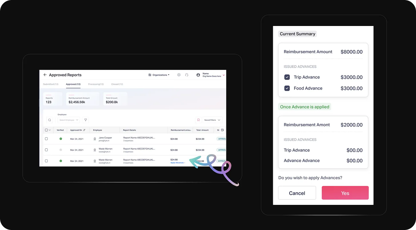 To allow users to apply for advances, we placed the call-to-action button near the reimbursement amount for easy discoverability. Upon interaction, we prompt users to select the advanced account they want to settle against. The interface keeps the user informed about the consequences of applying advances.