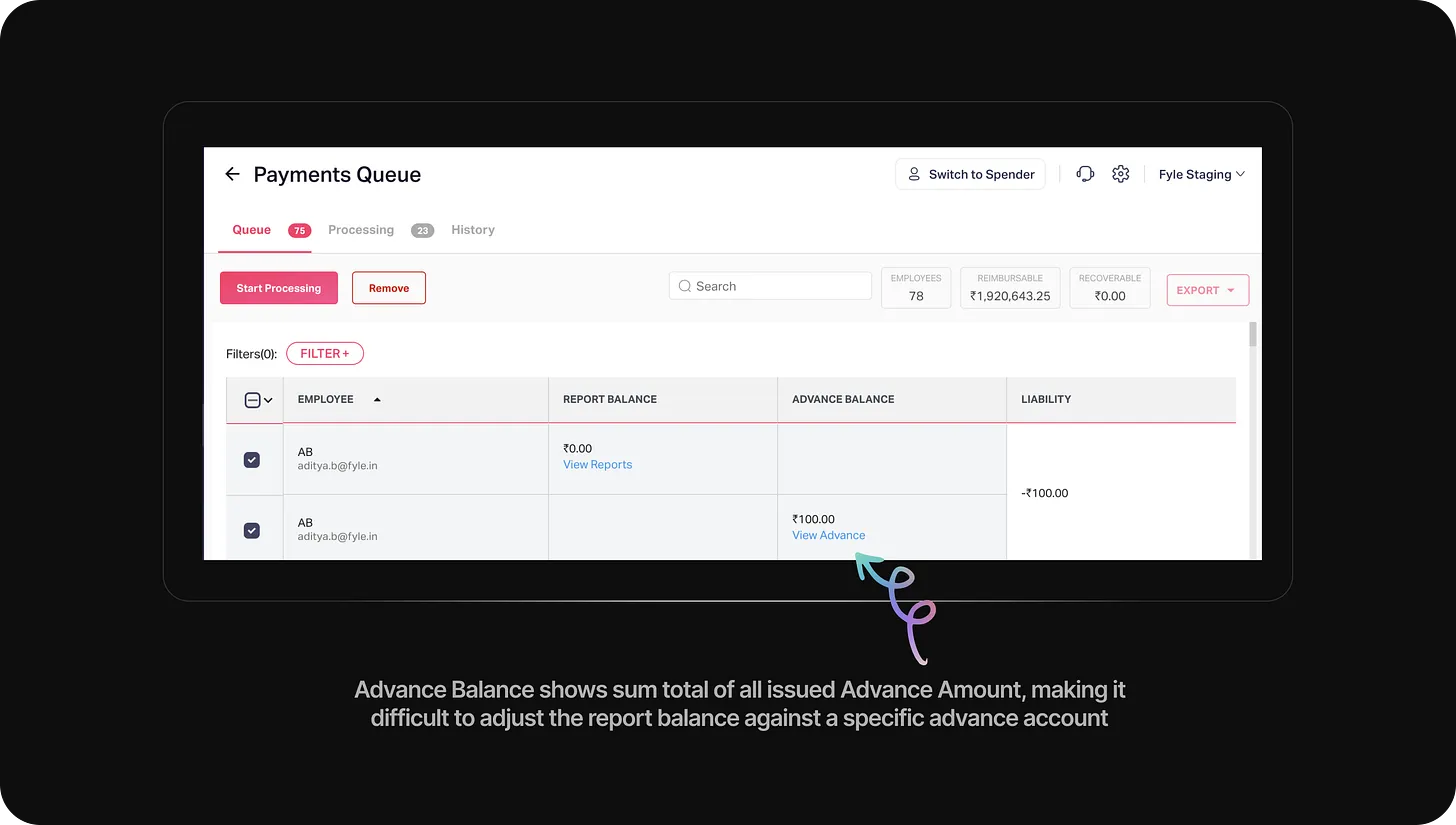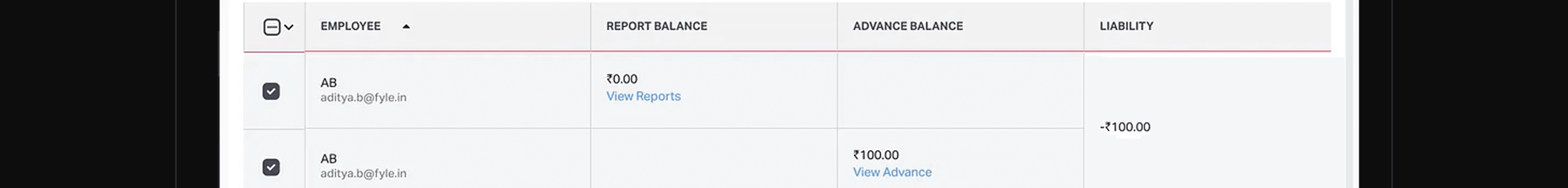 03. Settling the advance amount was confusing. The page displayed the same employee twice in a row—once representing the report balance and once representing the advance balance, along with the net liability.