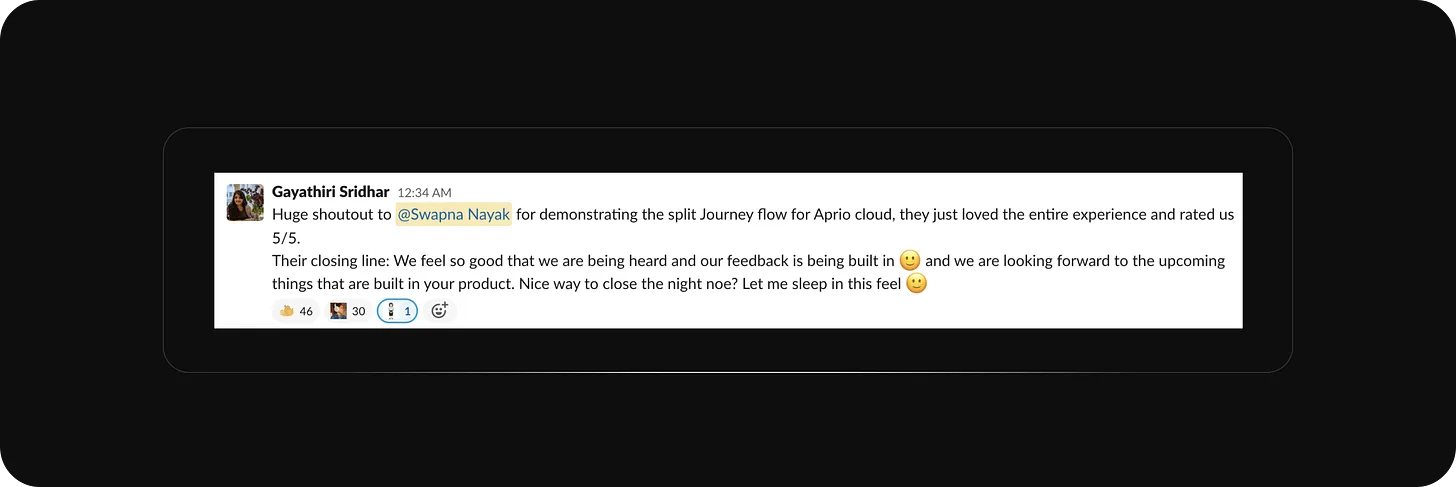 We conducted usability testing with at least 7 to 10 organizations, often during off-hours, to gather validation for our solution. I am very grateful to Gayathiri. She lifted my spirit throughout this initiative by offering feedback, participating in brainstorming sessions, or with a shoutout message like this.