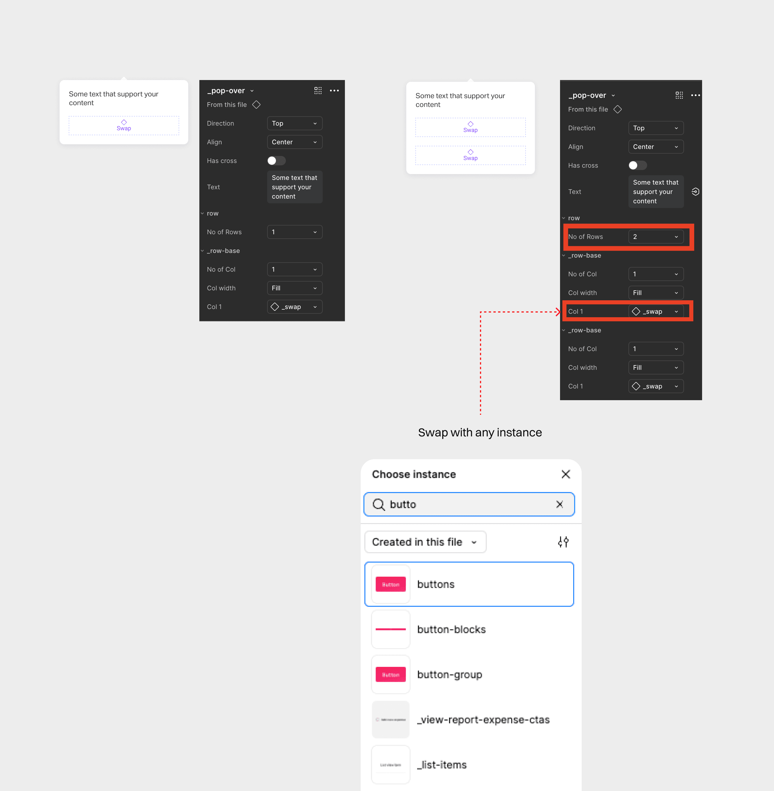 Allows seamless swapping of any row or column with a desired component using the "Choose Instance" option.