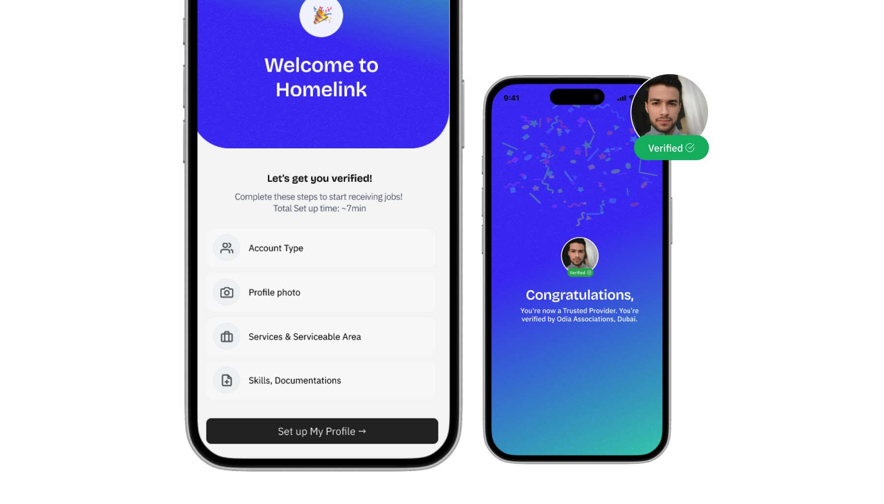 Homelink is a four-sided marketplace that helps Non-Residents (NRs) hire trusted Service Providers (SPs) in their native place—validated by association-appointed verifiers.